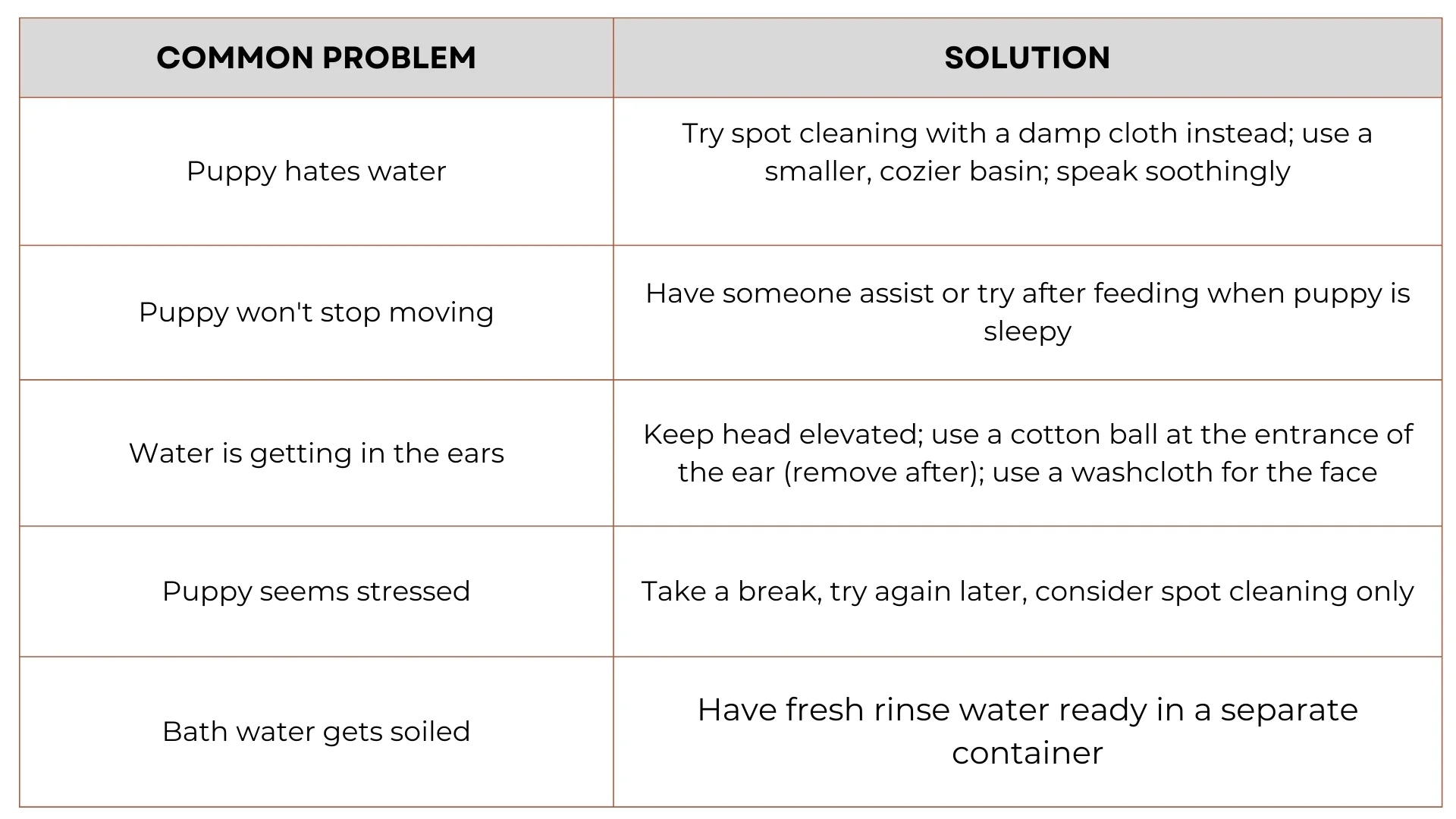 - Fill only 1-2 inches deep—just enough to clean the puppy without submerging them